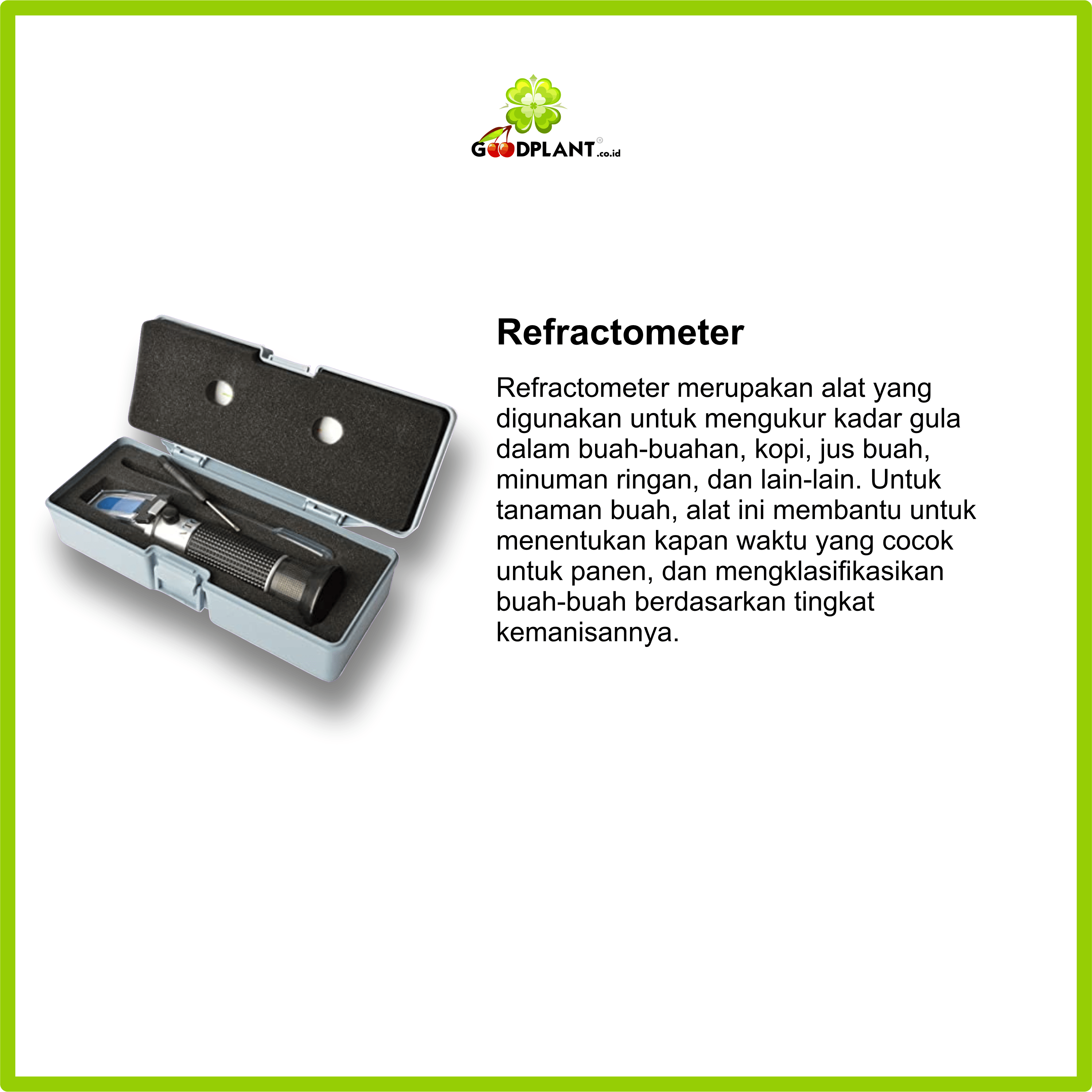 Refractometer merupakan alat yang digunakan untuk mengukur kadar gula dalam buah-buahan, kopi, jus buah, minuman ringan, dan lain-lain. Untuk tanaman buah, alat ini membantu untuk menentukan kapan waktu yang cocok untuk panen, dan mengklasifikasikan buah-buah berdasarkan tingkat kemanisannya.